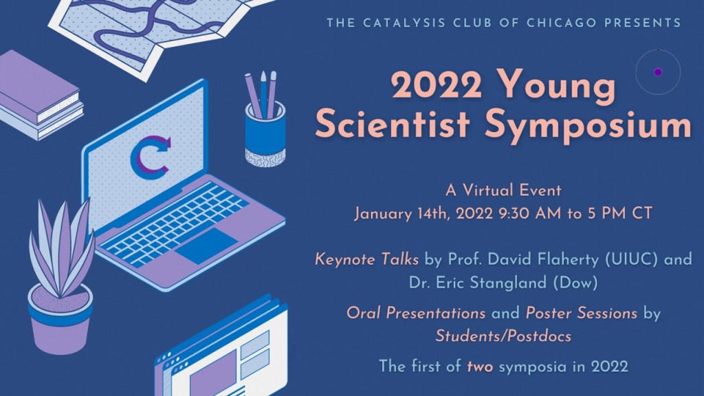 The Catalysis Club of Chicago (CCC) will hold its first annual Young Scientist Symposium virtually on Friday January 14, 2022. The program is scheduled to begin at 9:30 AM and end at 5 PM central time. We will hold a young scientist focused symposium in the winter in addition to the traditional spring symposium at the end of our annual cycle. This symposium will feature eight student/postdoc speakers, a poster session, and both technical and career focused keynote speakers, Prof. Dave Flaherty (UIUC) and Dr. Eric Stangland (Dow) respectively. The spring symposium in May will feature additional keynote lectures and more time for networking but will not have a poster session. With this format, we aim to increase our ability to highlight the amazing work performed by students and postdoctoral researchers in the CCC Geographic area, while providing an additional opportunity to network and get to know members from other institutions within the club.