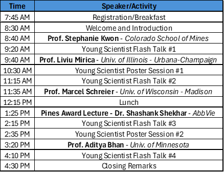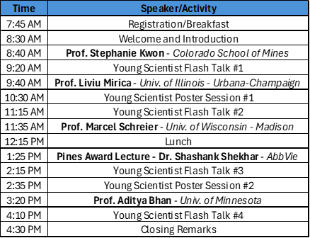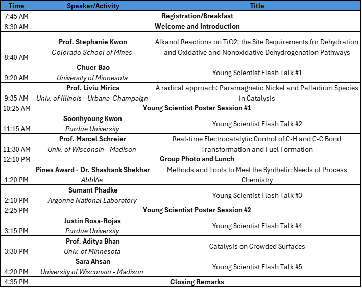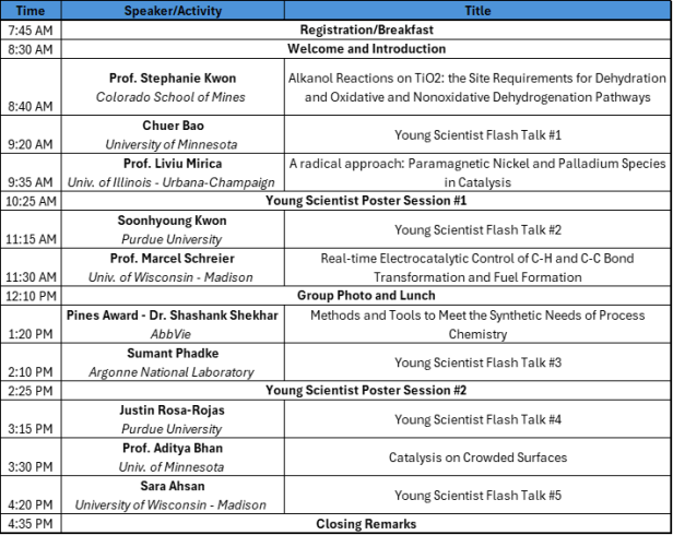 We will be holding the annual Catalysis Club of Chicago Spring Symposium on May 4th, 2026 from 7:45 AM – 5:00 PM. This year’s symposium will feature a Young Scientist Poster Session and will be hosted by GTI Energy at 1700 S Mt Prospect Rd, Des Plaines, IL 60018. Our great schedule of academic, industrial, and student presenters for the 2026 CCC Spring Symposium can be found below!